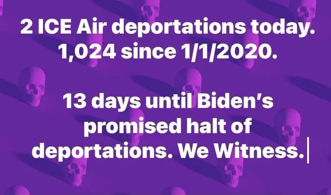 Ø No Slow Down During Presidential Transition. Ø 22 Deportations – Most since the week of 9 November. To 8 different countries. Ø 3 Deportation flights to Honduras. First flights in 9 weeks following devastation from 2 hurricanes. Ø 97 Total flights – Most since week of 6 October. Photo is the 1st deportation flight of the year arriving and disembarking in Guatemala this week.