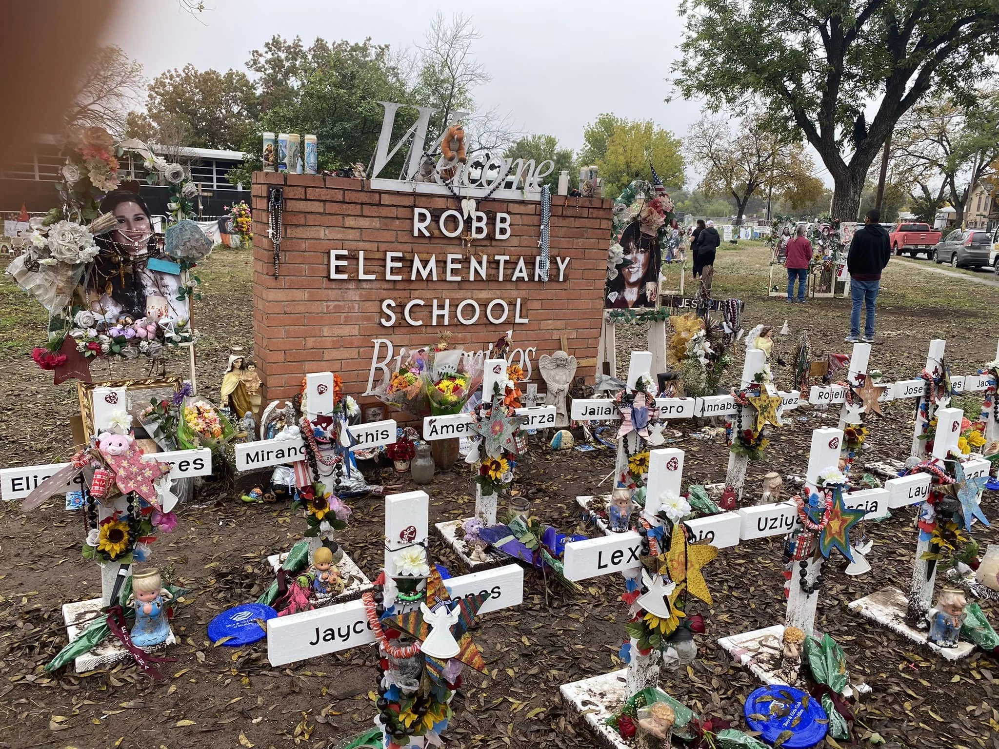 We turn a corner, and fragments of remembered images that I didn’t know I had open an abyss, and it feels like I am on its edge, about to fall. Crosses like shrubs planted in front of a sign placed diagonally on the corner. Robb Elementary. We have come to Uvalde, where half a divided town wants to remember, to never let go of their slaughtered children and teachers, and others want it to go away. A star-crossed town, close enough to the border between the US and Mexico that it teems with immigration police, the border patrol, the Texas Rangers.