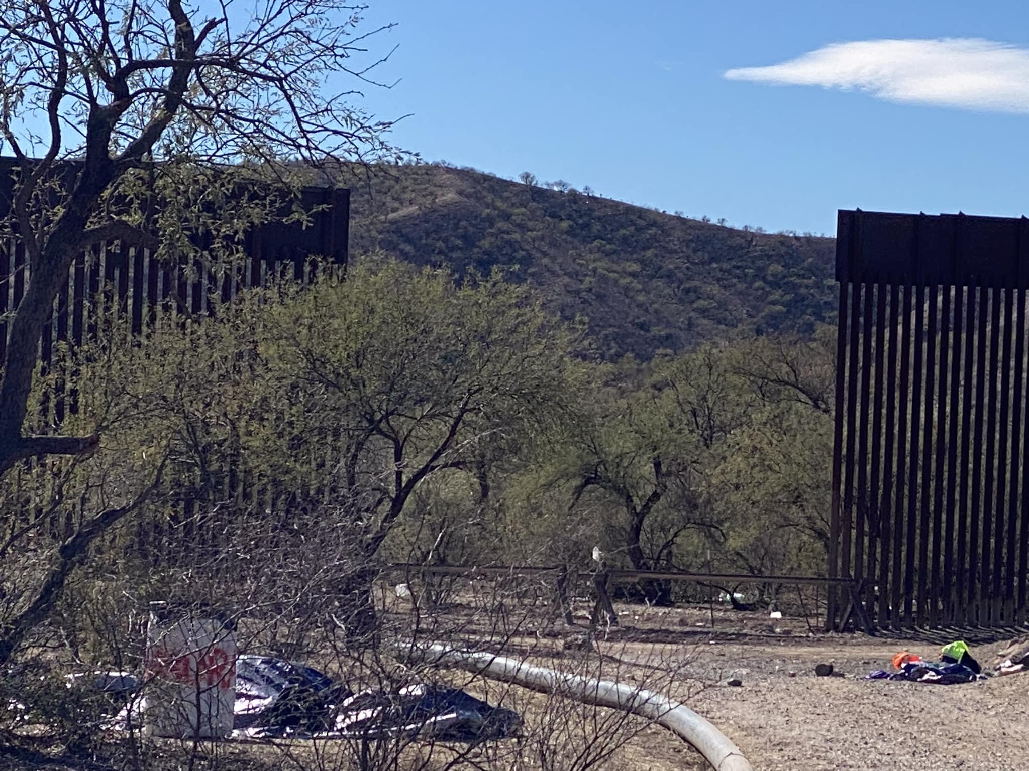 Two days ago three of us rode in the car I had rented, along a section of the wall east of Sásabe, up and down the steep hills of mountainous terrain, to a camp set up to offer water, food, and the shelter of tarps and small tents to migrants who had been led by their coyotes to a place miles and miles away from the port of entry. When we arrived, it appeared that the camp was empty.